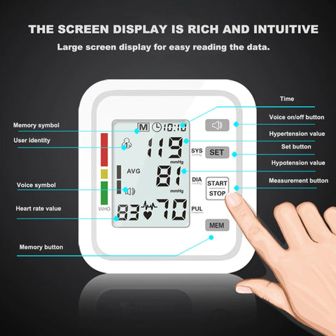 Our Blood Pressure Monitor is meticulously crafted to cater to your health needs with unparalleled precision and convenience. Picture this: a crystal-clear LCD display that presents your readings in an easily readable format, coupled with a live-voice broadcast of your blood pressure levels. No more squinting at tiny numbers or decoding cryptic measurements – our monitor offers effortless, on-the-spot clarity.